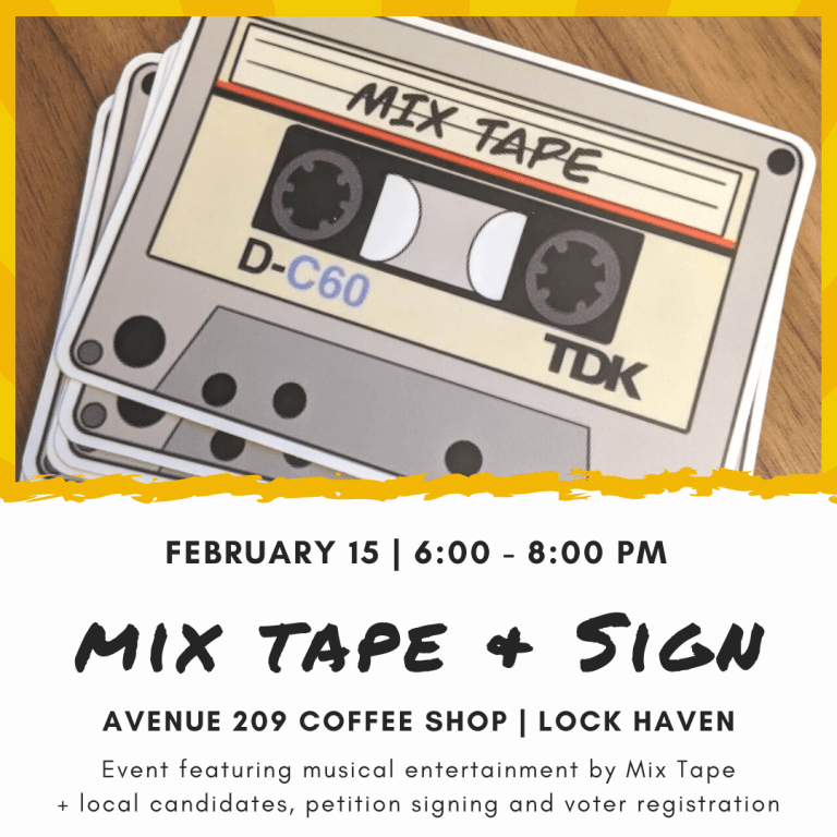 Local band Mix Tape will perform at Avenue 209 Coffee Shop, 209 Bellefonte Ave., Lock Haven, on Wednesday, February 15 for a petition-signing event. Come listen to music, and sign petitions at the same time!