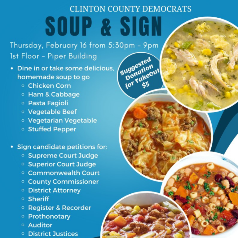 Enjoy free soups (six choices!), take part in fellowship with like-minded community members, and sign petitions for Democrats seeking office. The event will take place at the Clinton County Piper Building, 2 Piper Way, Lock Haven.