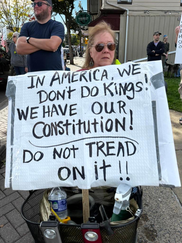 “What an amazing experience with such incredible people! We saw over 375 wonderful patriots at the No Kings Protest today! That’s almost DOUBLE of the last No Kings in LH! This event was very peaceful, especially with the countering Pro-Kings ‘rally’ of 6 people!” said Bre Brannan, chair of the Clinton County Democratic Committee (CCDC). “Despite this time in history being so heavy, we made it lighthearted and fun with inflatable animals, bubbles and a fun playlist! We also ended the day with a resounding and boisterous Pledge of Allegiance! This is what community looks like. This is what democracy looks like!”