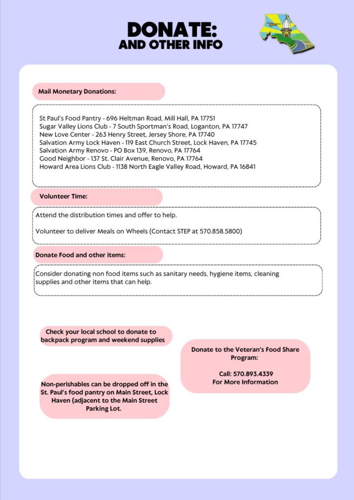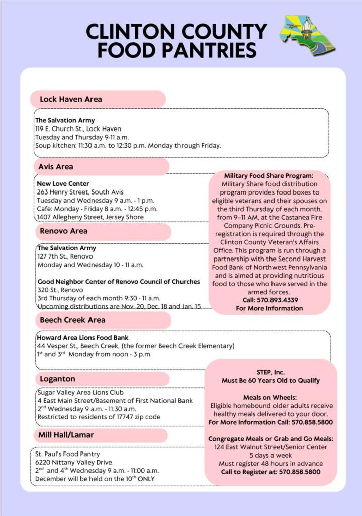 Below are resources to food pantries and services in Clinton County, Pennsylvania.