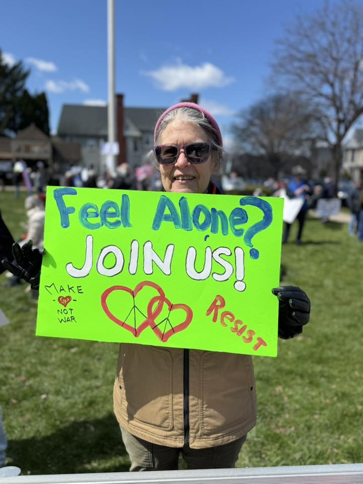 In addition to the typical signs, this gathering featured information tables, vendors and music by local band Echo & Sway. Indivisible, CCDC and Clinton County Democratic Women (CCDW) set up tables to share information and local resources and to help people register to vote. The Clinton County Community Food Bank set up to sell items and accept donation to support their weekly efforts. The CCDC and CCDW were also selling garden flags (for $25) and pins (for donations) that feature the Pennsylvania design of the Civil Resistance bird. (Note: The design can also be purchased on t-shirts and flags directly from Rachael K Creations.)